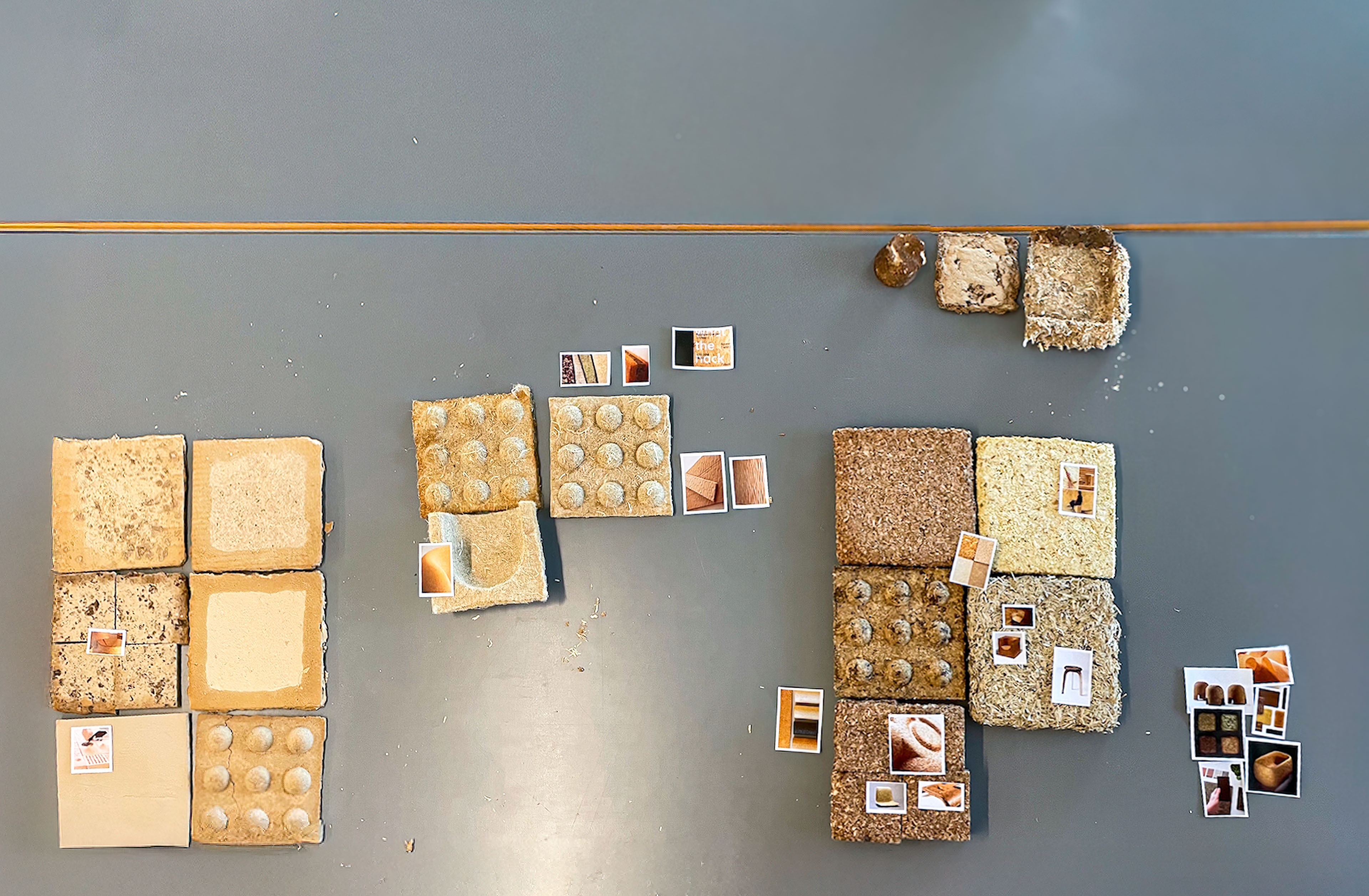 Across roughly twenty experiments, different fibre-binder combinations and forming methods, mould pressing, wet forming and high-pressure pressing, were tested and documented. Each recipe revealed its own balance between strength, texture and surface quality: from dense, smooth hardboard panels to lightweight, fibrous hemp mats. Measuring parameters such as pressure, time and dimensional change helped make material behaviour visible and comparable, allowing insights to emerge through making.